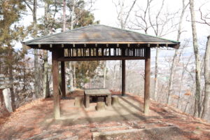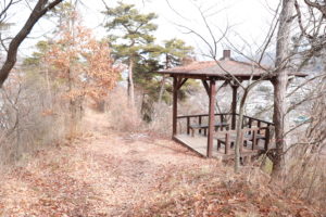 息を切らしながら5分ほど上がって行くと、遊歩道のヘアピンカーブの所に東屋がありました。