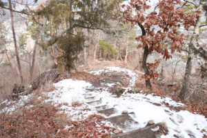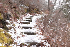 ちょうど山影で陽が当たらない側に遊歩道があり、凍っている部分もありました(恐)。