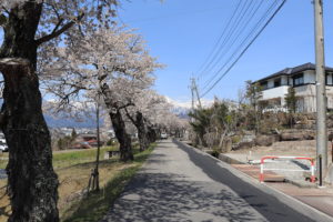 市民の森の前の道路を少し北へと歩いて行くと、「大町観光道路」があります。道路沿いに桜並木が続き、並木の向こうに北アルプスの姿を見ることができます。薄ピンク色の優しい桜並木と北アルプスの組み合わせも素敵ですよ♫