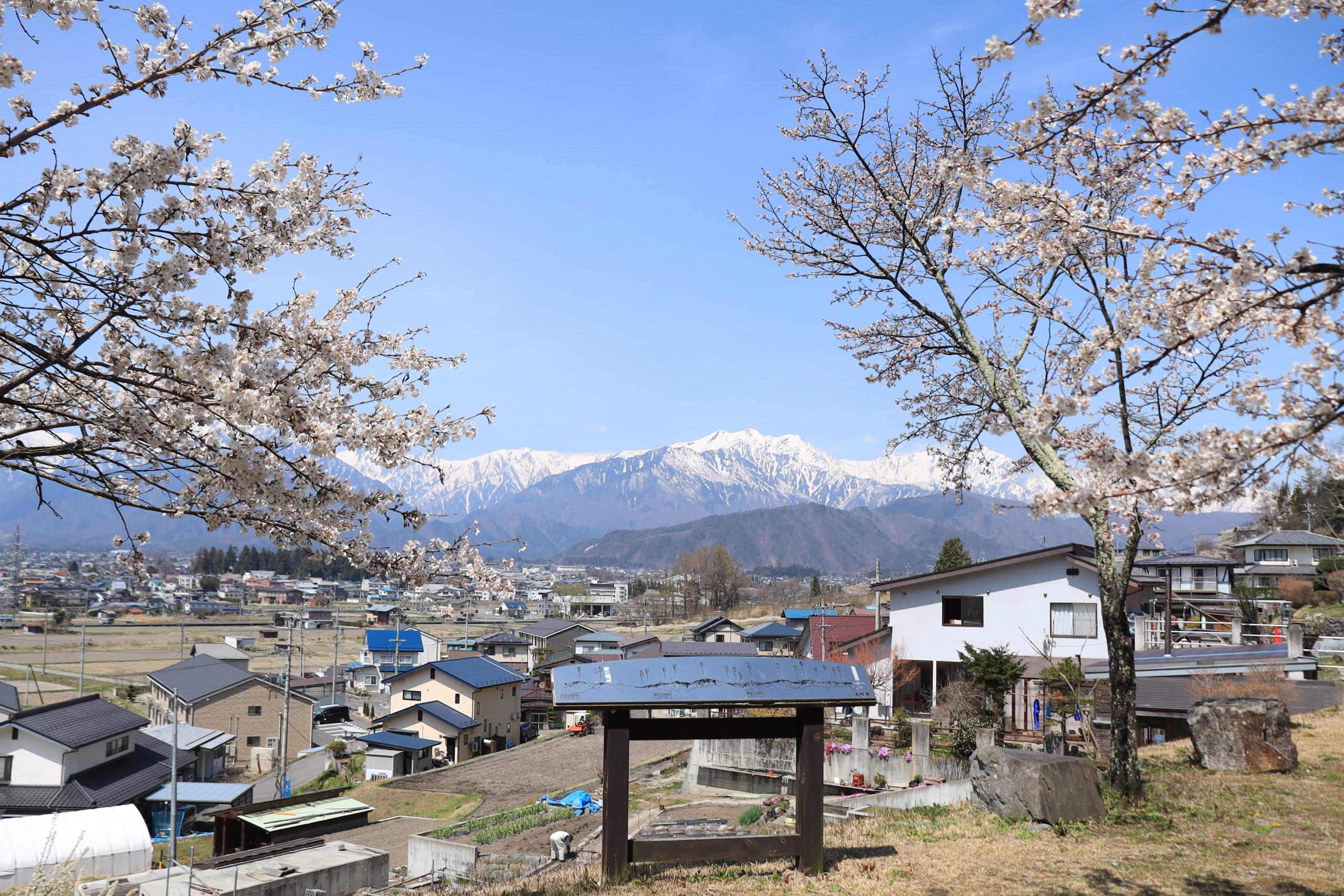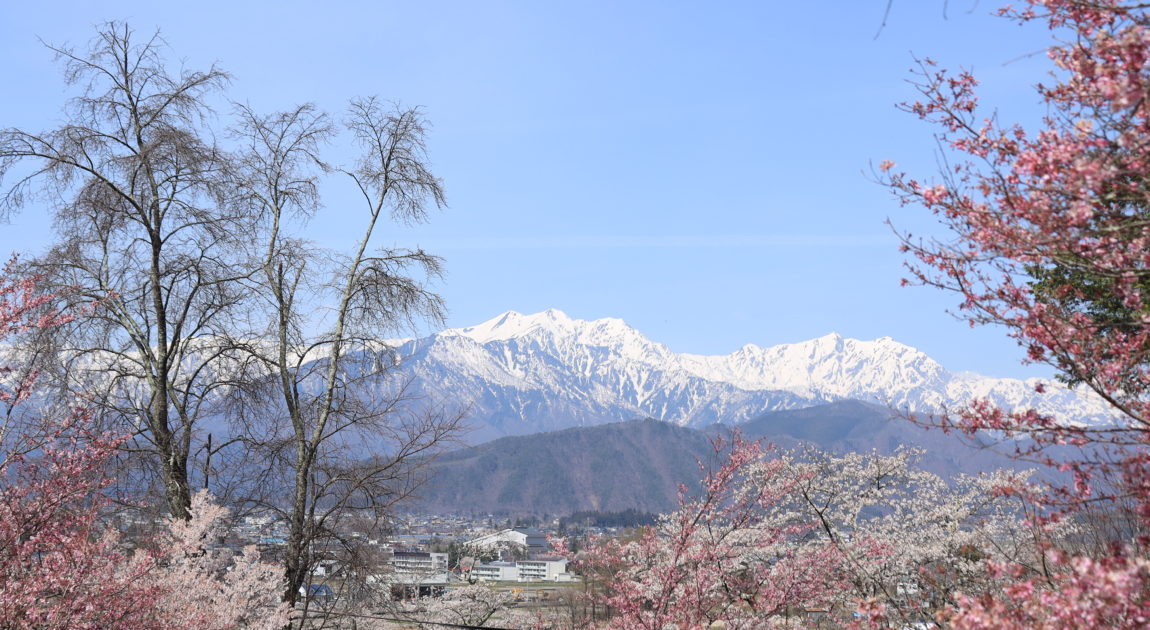 春には様々な種類の桜が咲き、北アルプスの眺望を一層引き立てます。