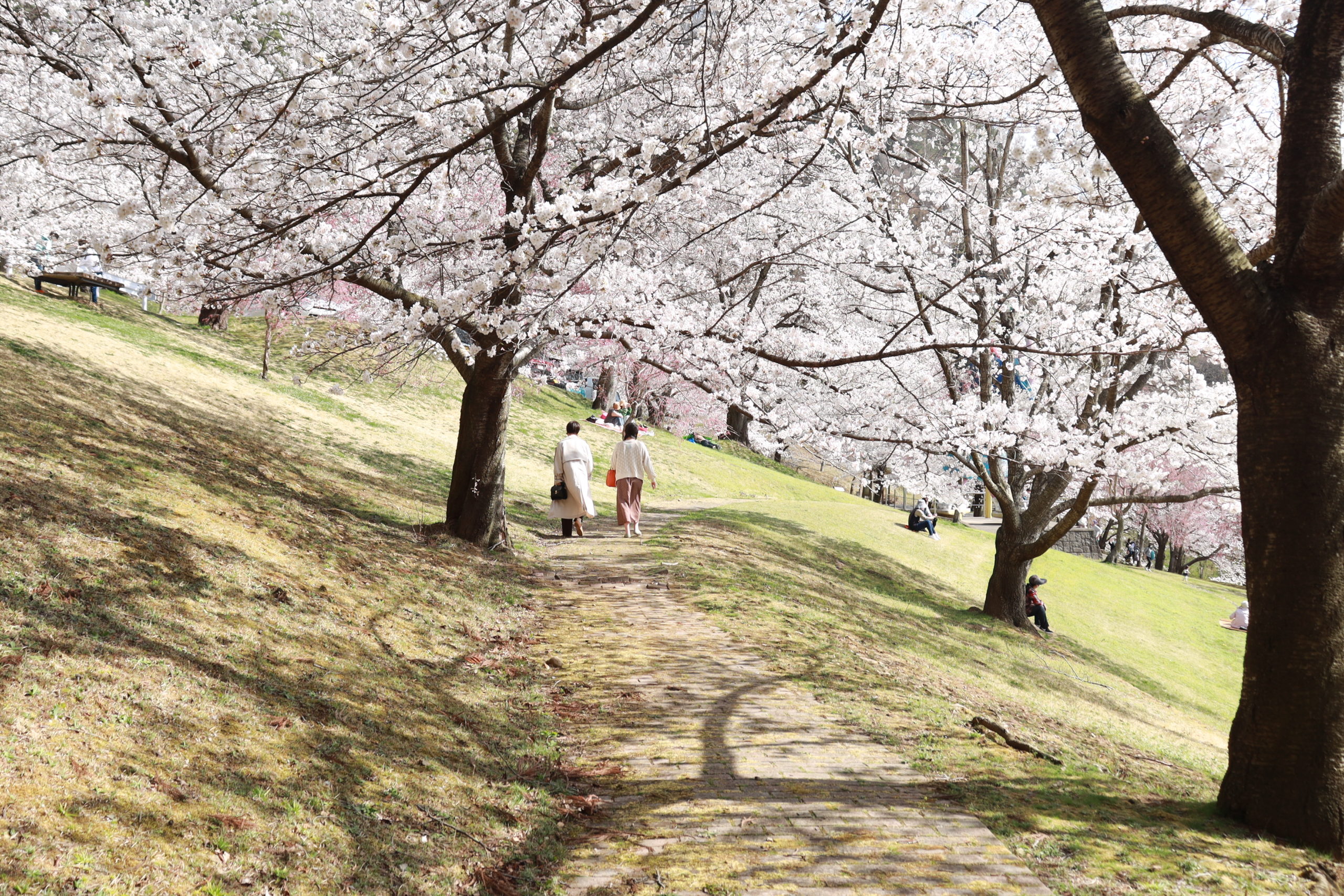 山腹の傾斜のある公園なので、徒歩で車道や園内の階段を上り下りするのは若い方でも結構大変です(汗)。お花見だけが目的なら、無理に園内を歩かずとも車を停めた場所付近で十分お花見が楽しめますよ。ベンチや東屋も点在しているので、そこでゆっくりと観賞する方も多く見受けられます。