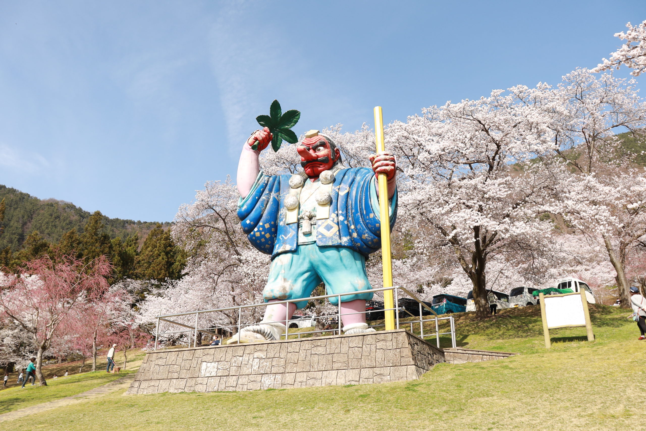 大きな天狗がシンボルの山腹にある公園です。