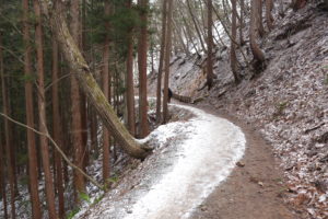 編集者はどちらのルートも歩いたことがありますが、足腰にくるのはやはり後者の方ですね。ただ、景色は割と開けていて、右下に横湯川の流れを見ながら進むことができます。