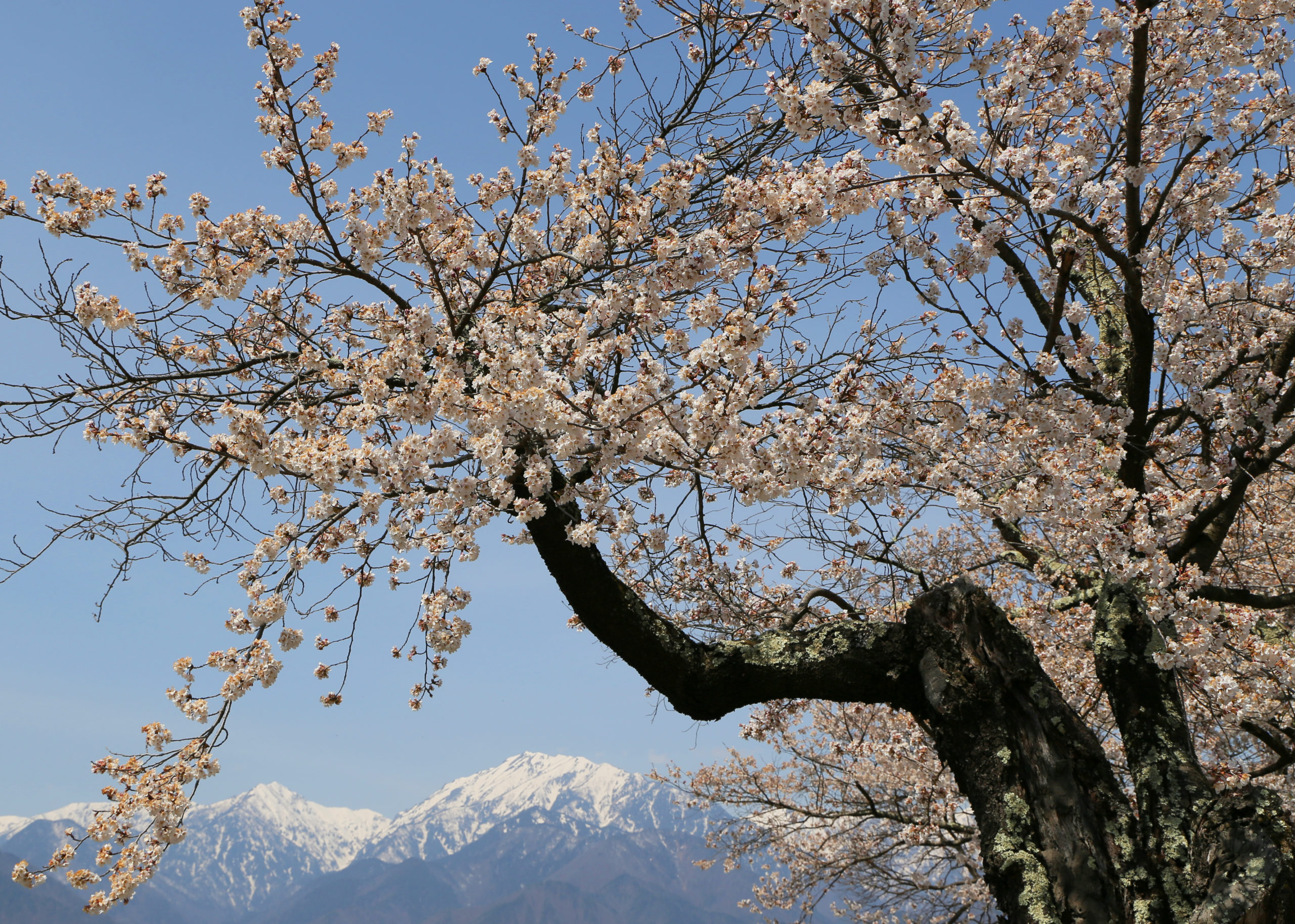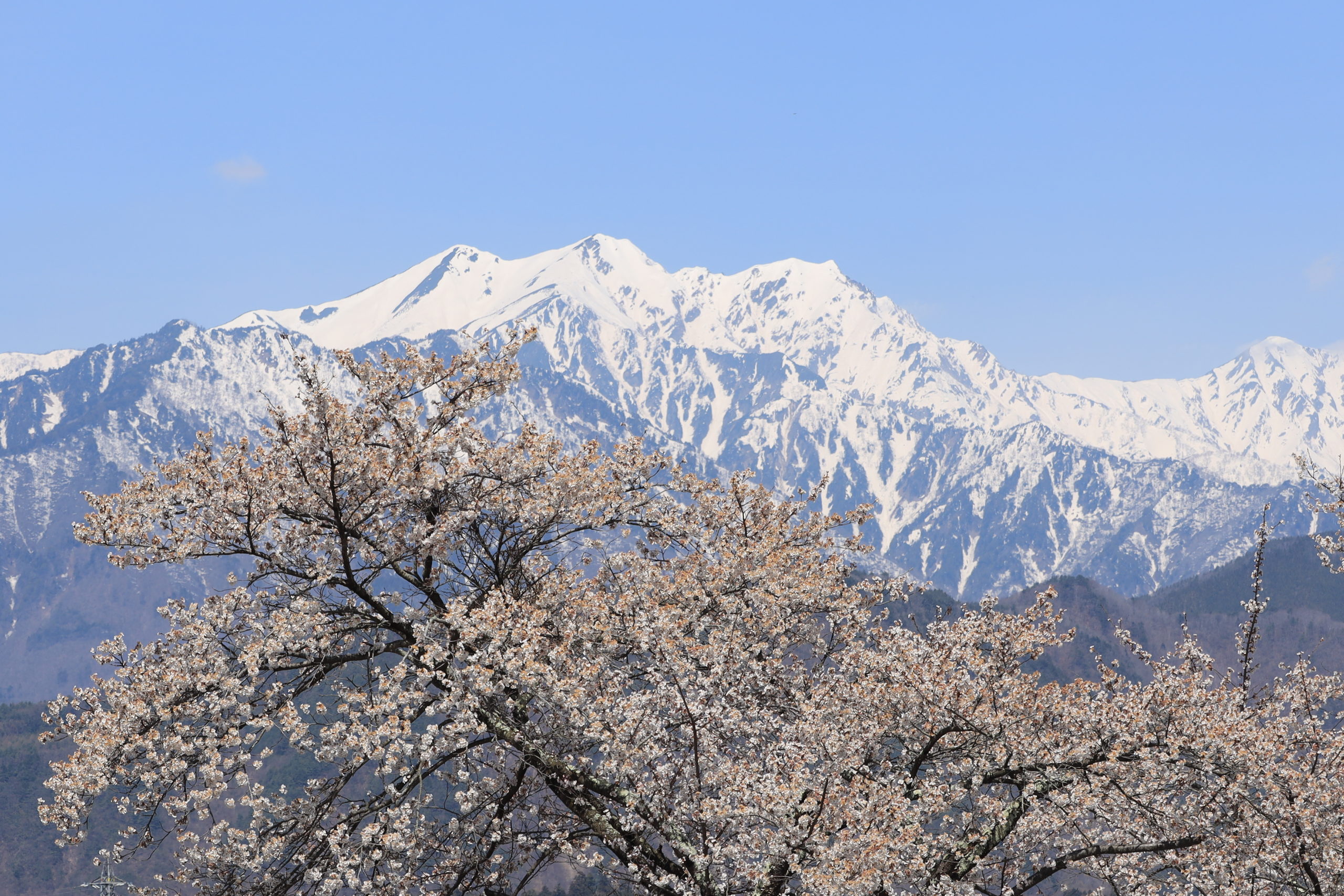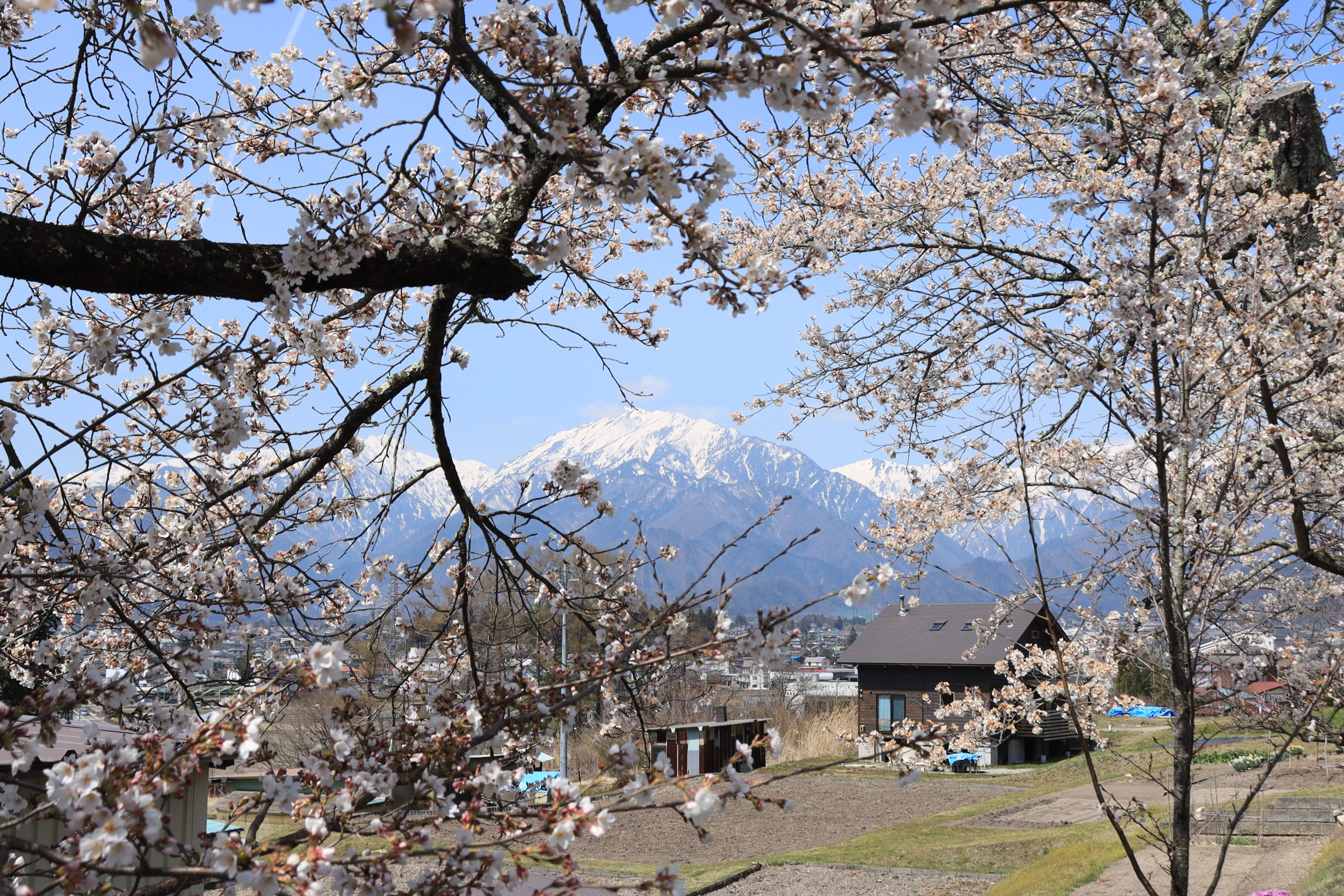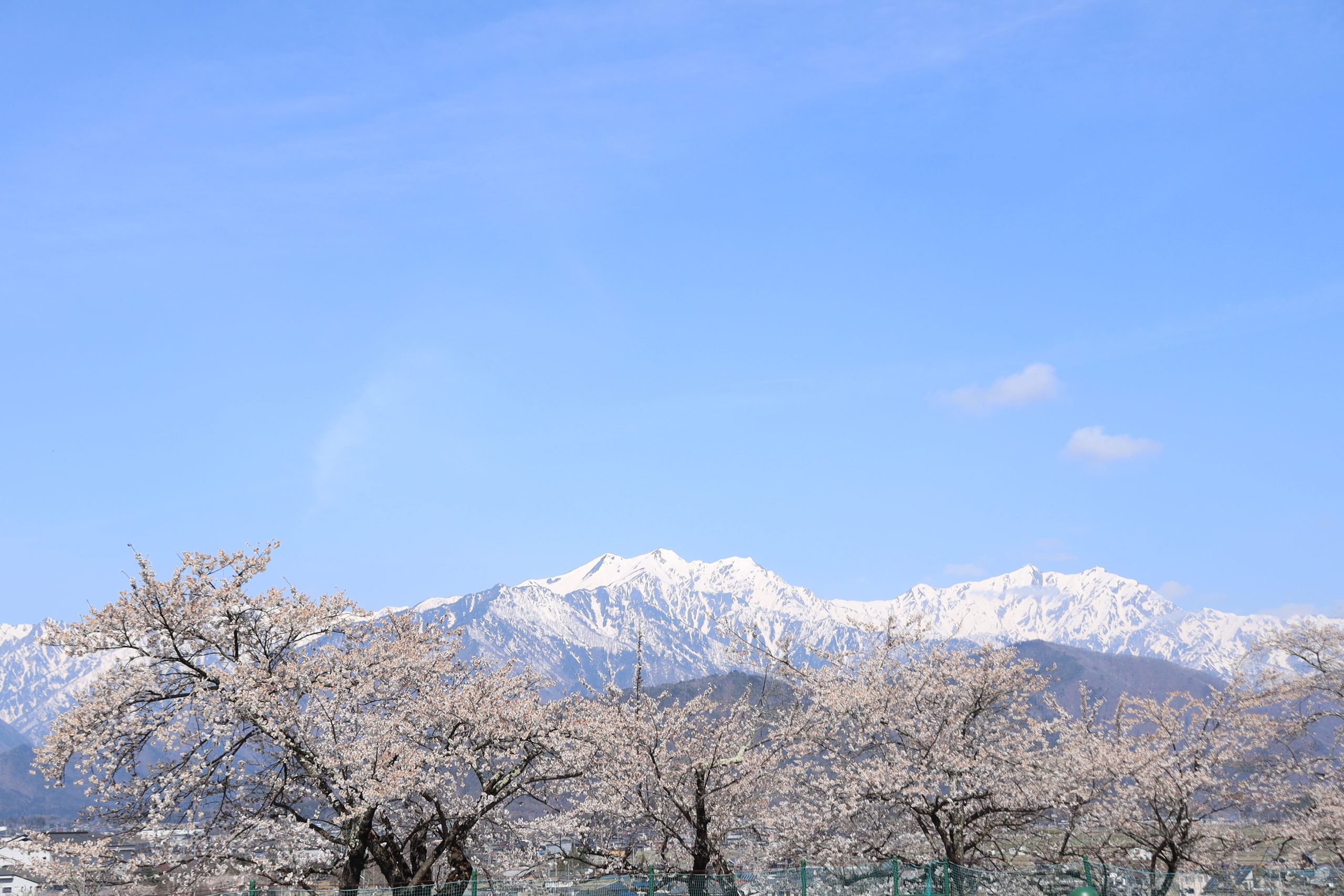 大町の桜の名所のひとつ、大町観光道路。観光道路と言ってもなんの変哲もない一般道路なのですが、道路沿いに桜並木が続き、その向こうに北アルプスを望むことができるという景観は、思わず観光道路と名付けてしまいたくなるのもうなづけます。