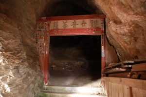 確かに、岩壁に張り付いて建っているお堂の脇に岩壁の中へと続く出入口が、、!