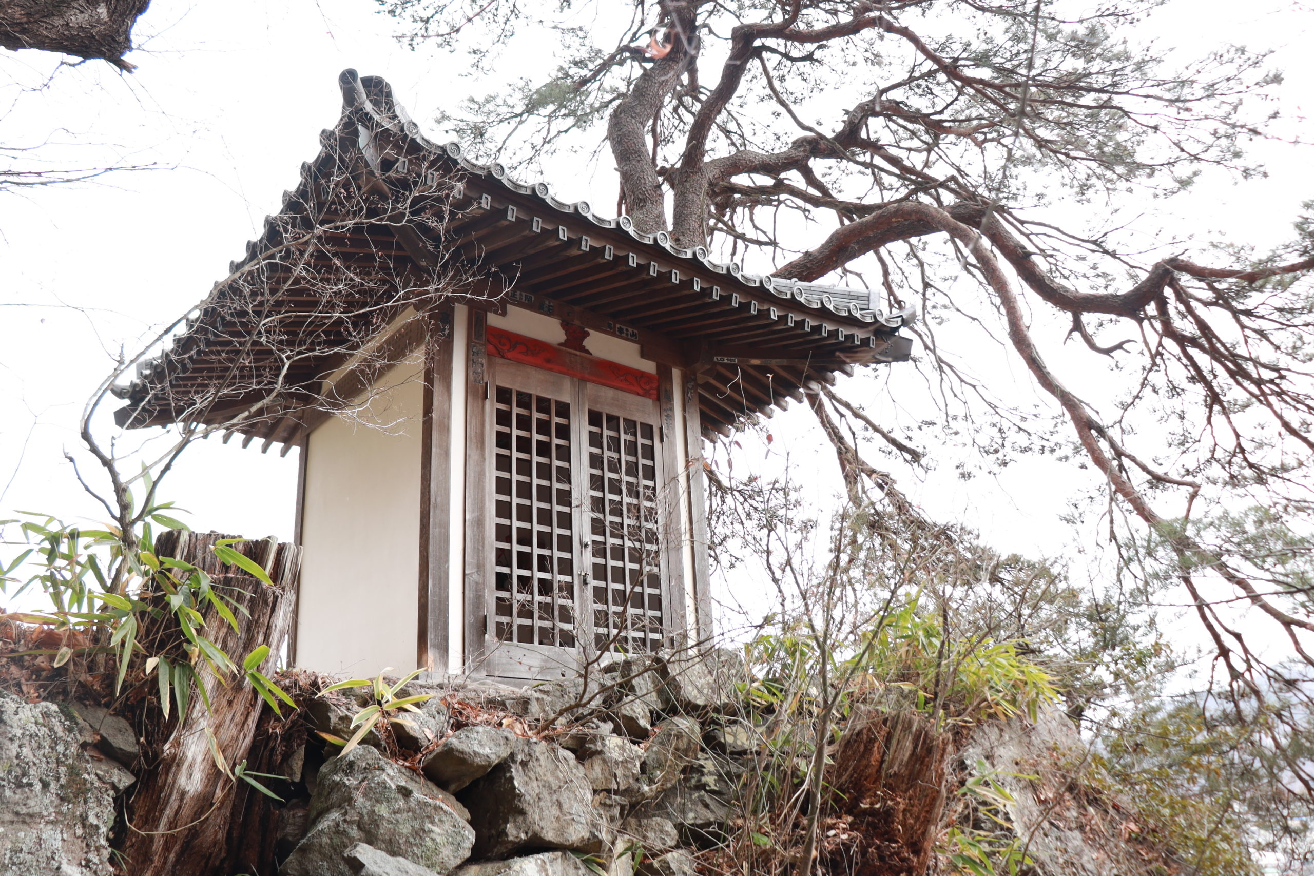 上田市丸子近辺の県道152号線を車で走っていると、民家の間から山の中腹辺りに朱一点、お堂が建っているのが遠目に見えます。写真をご覧の通り、鮮やかな朱色のお堂なので遠くからでも何かあるなというのがよく分かります。