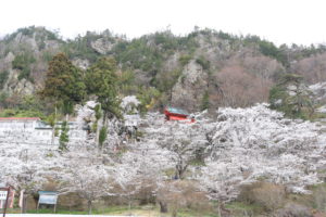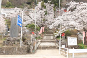 石段の途中、左側には「義仲桜」が圧倒的な存在感を放っています。古木ながらしっかりと枝に花が咲き、見事でした!