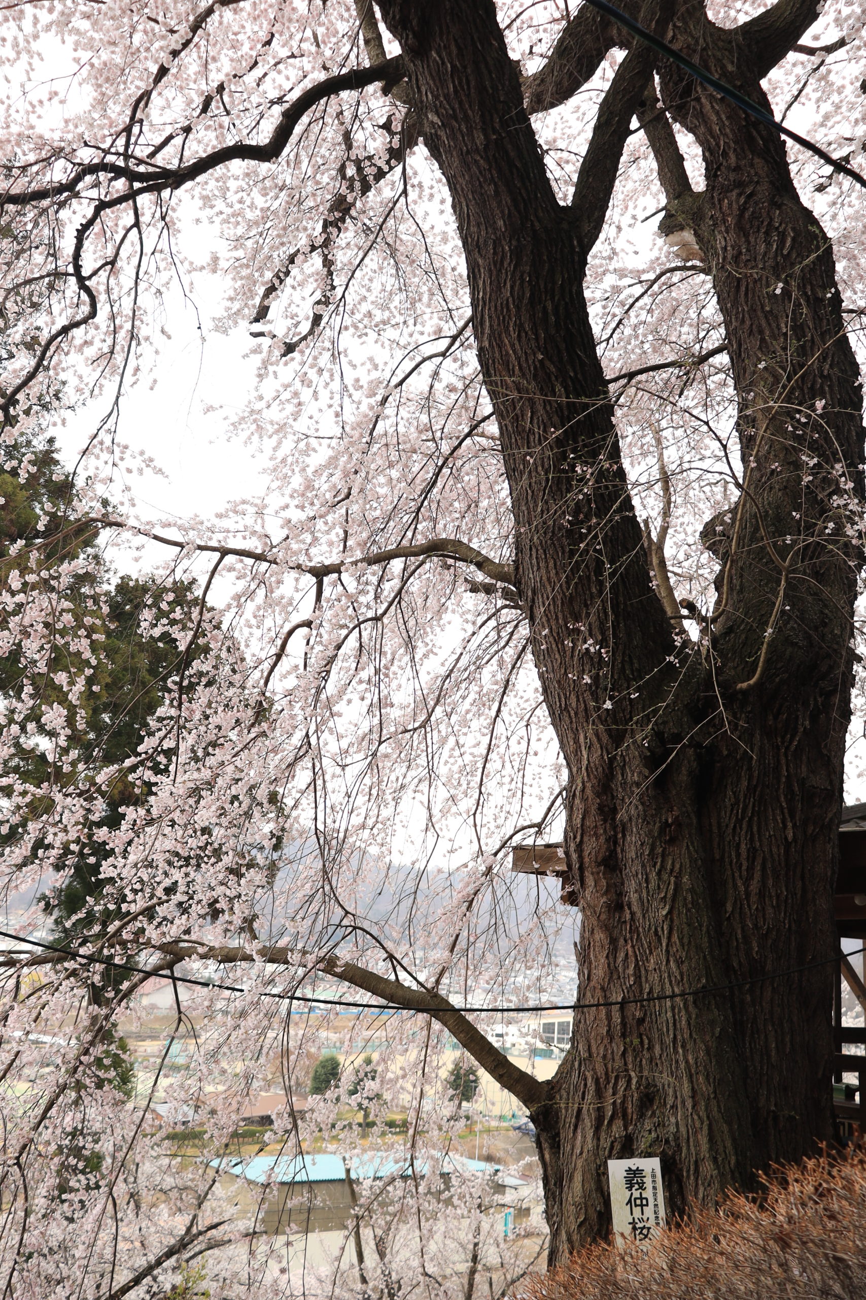 このお寺はかつて木曽義仲が戦勝祈願をしたと言われており、馬に乗って参道を駆け上がり、馬をこの桜の木に繋いでお参りしたそうです。