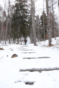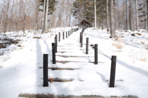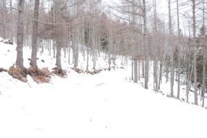 お手洗いの脇を通りすぎ、伸びている山道へと足を踏み出しました。すっかり雪に覆われていたのでどこが道なのか写真ではよく分かりませんね(苦笑)。