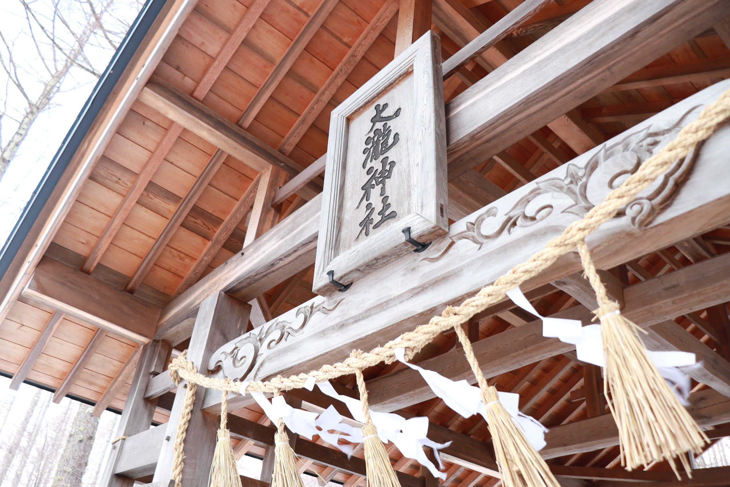 大瀧神社のご祭神は、諏訪大社と同じく水・風、農耕・狩猟・開拓といったものを司る建御名方命(タケミナカタノミコト)で、社殿の四隅には諏訪大社の御柱祭に合わせて曳き建てられたもののようです。