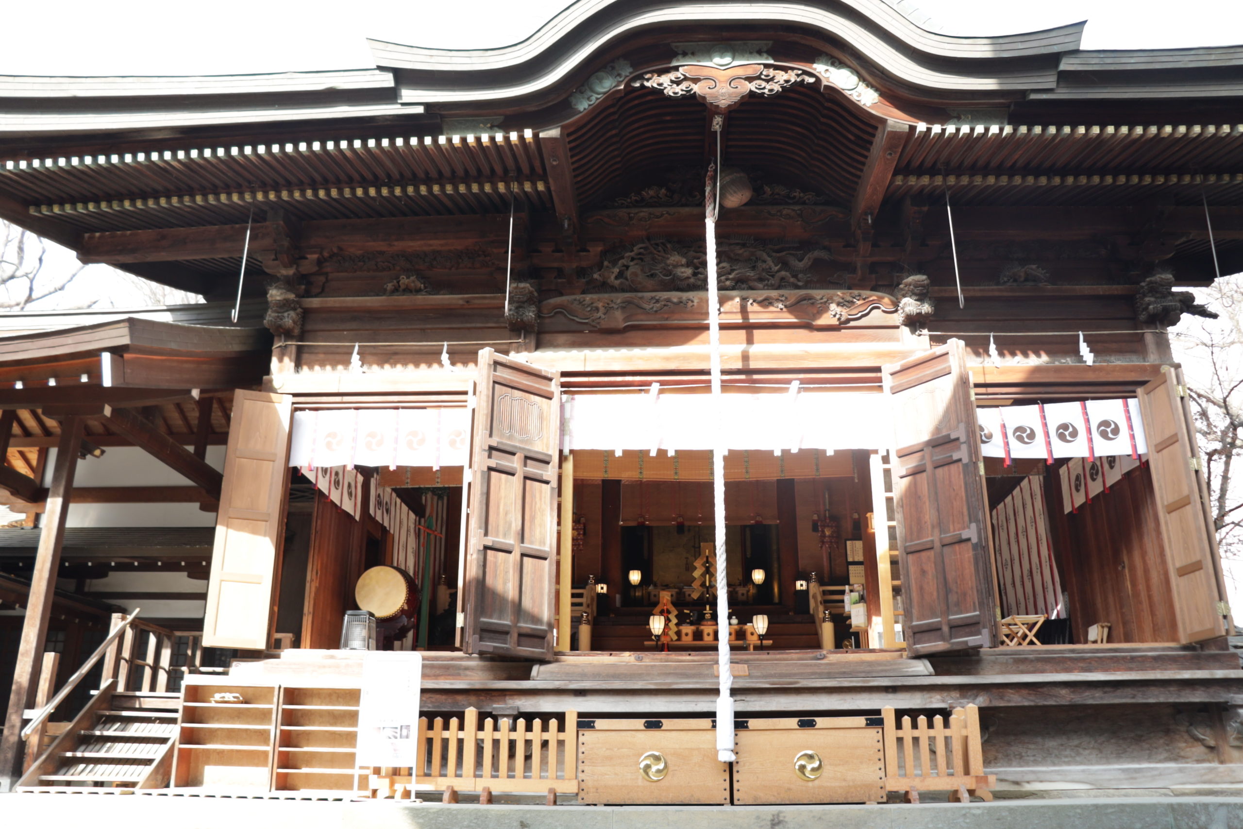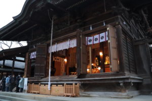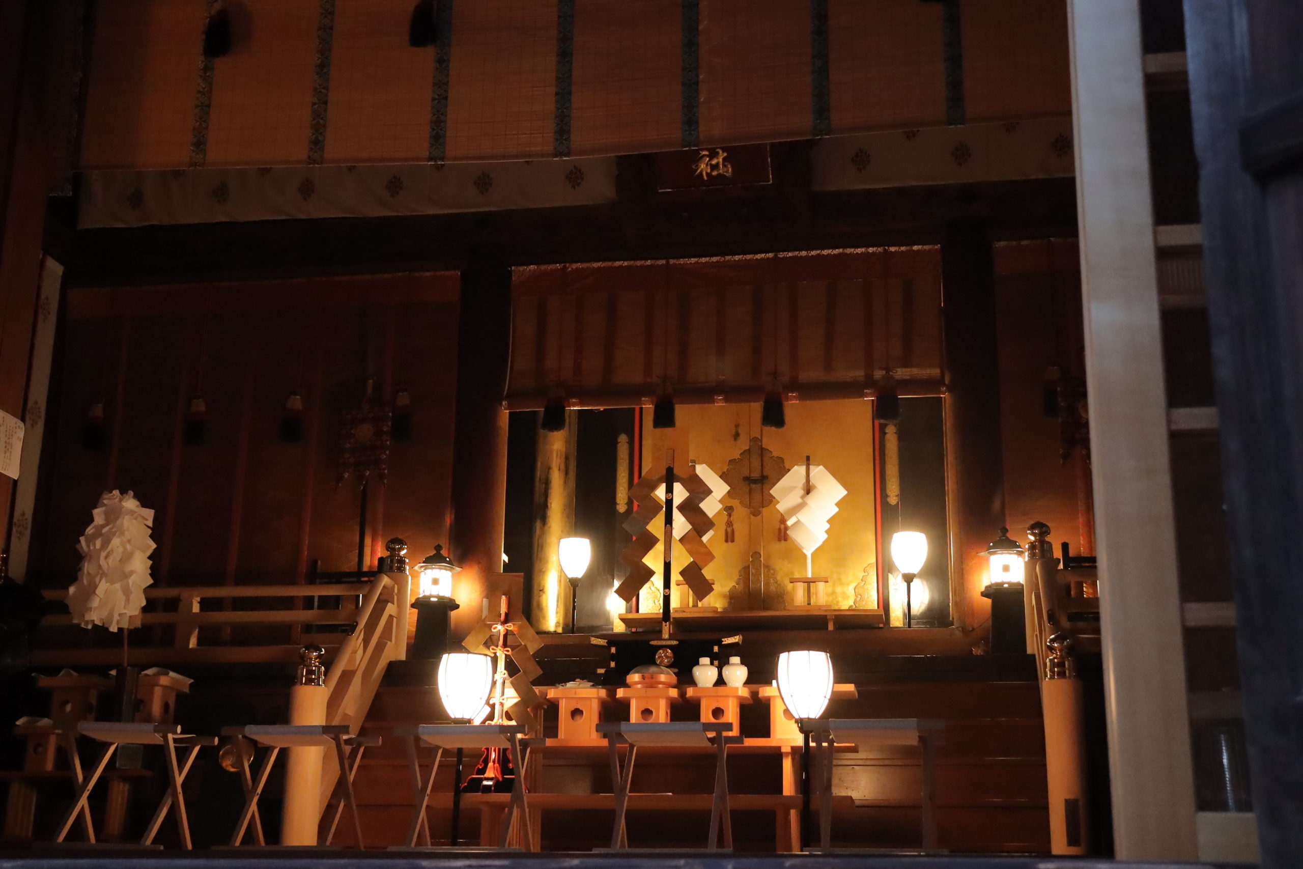 その頃には辺りは薄暗くなり始め、社殿内部には灯りが灯っていました。