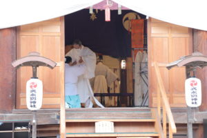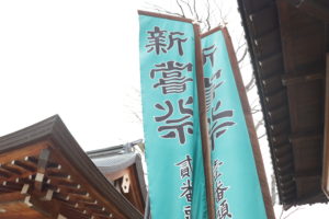 ↑新嘗祭の旗と拝殿で装束に着替える様子