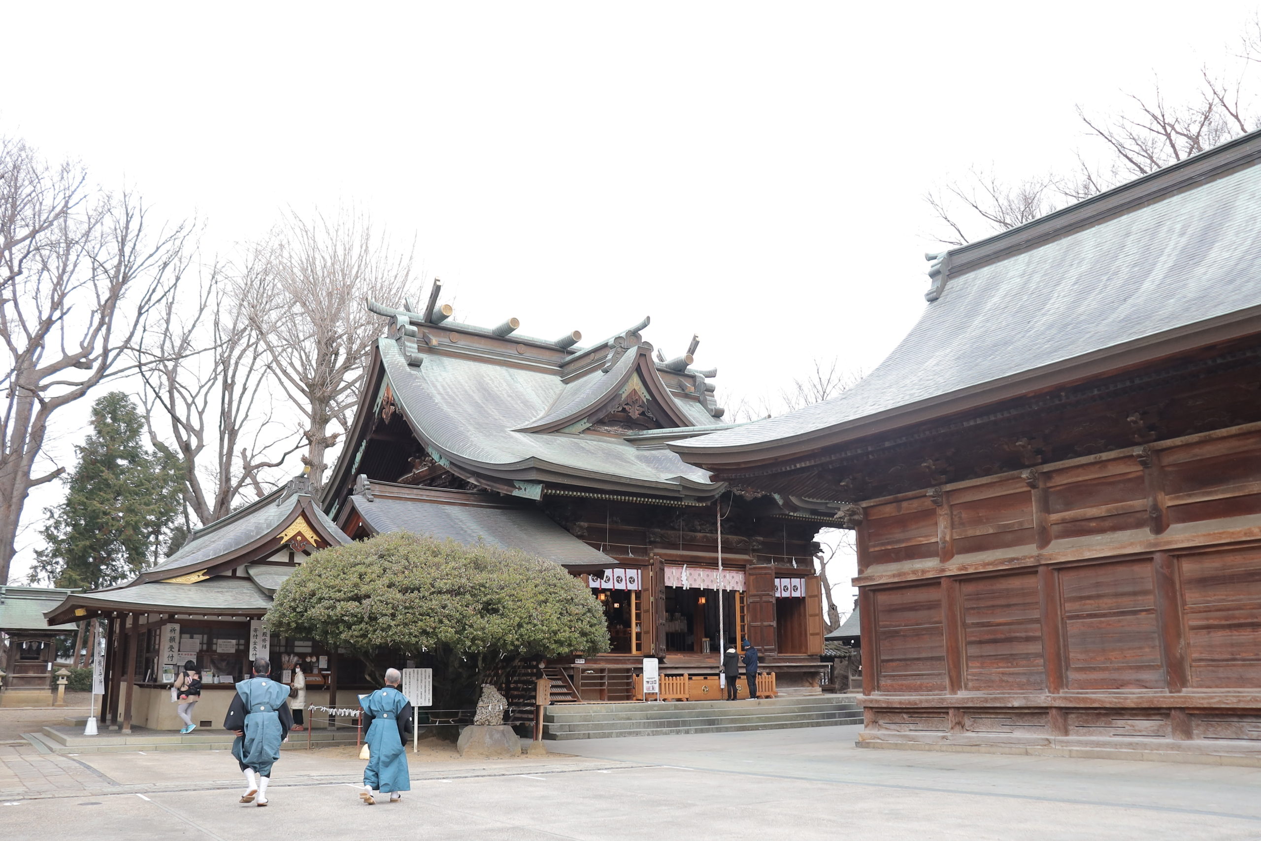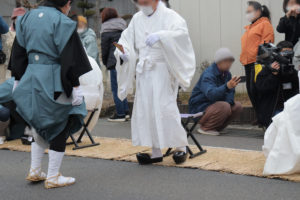 ひと通り参拝を終えると、境内脇の出入り口にて再び草履へと履き替え、一行は境内脇の歩道を歩いて再度正面から境内中程へと戻ってきて祭事は終了となりました。