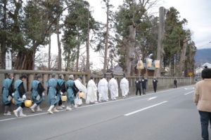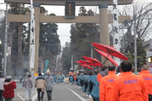 約1㎞の道のりを、途中にある臼道祖神社にもお参りしながら行列はゆっくりと進みます。