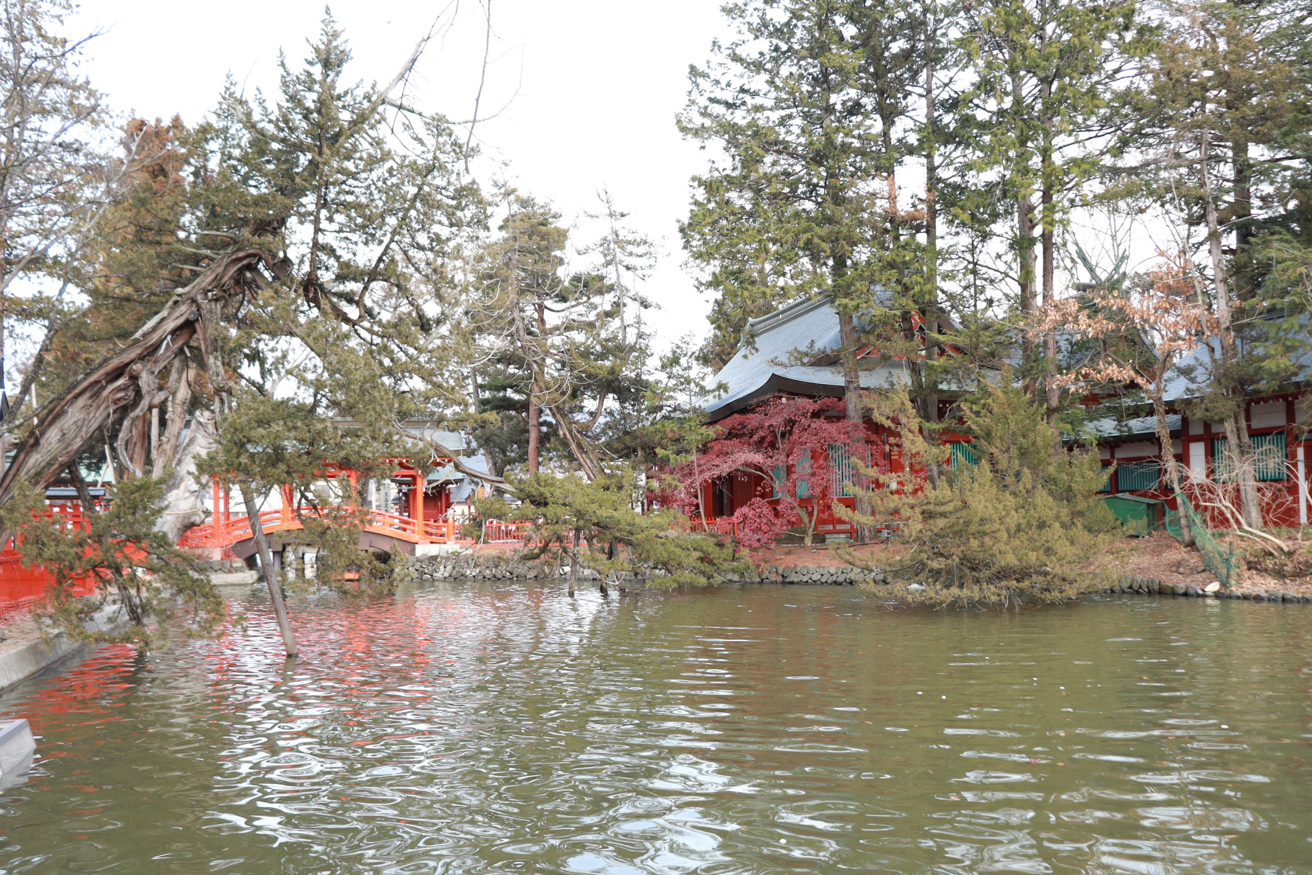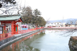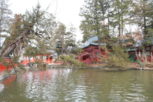 神池に囲まれた内殿は県宝に指定され、朱塗りの鮮やかな社殿や鳥居と池の様子には目を見張るものがあります。