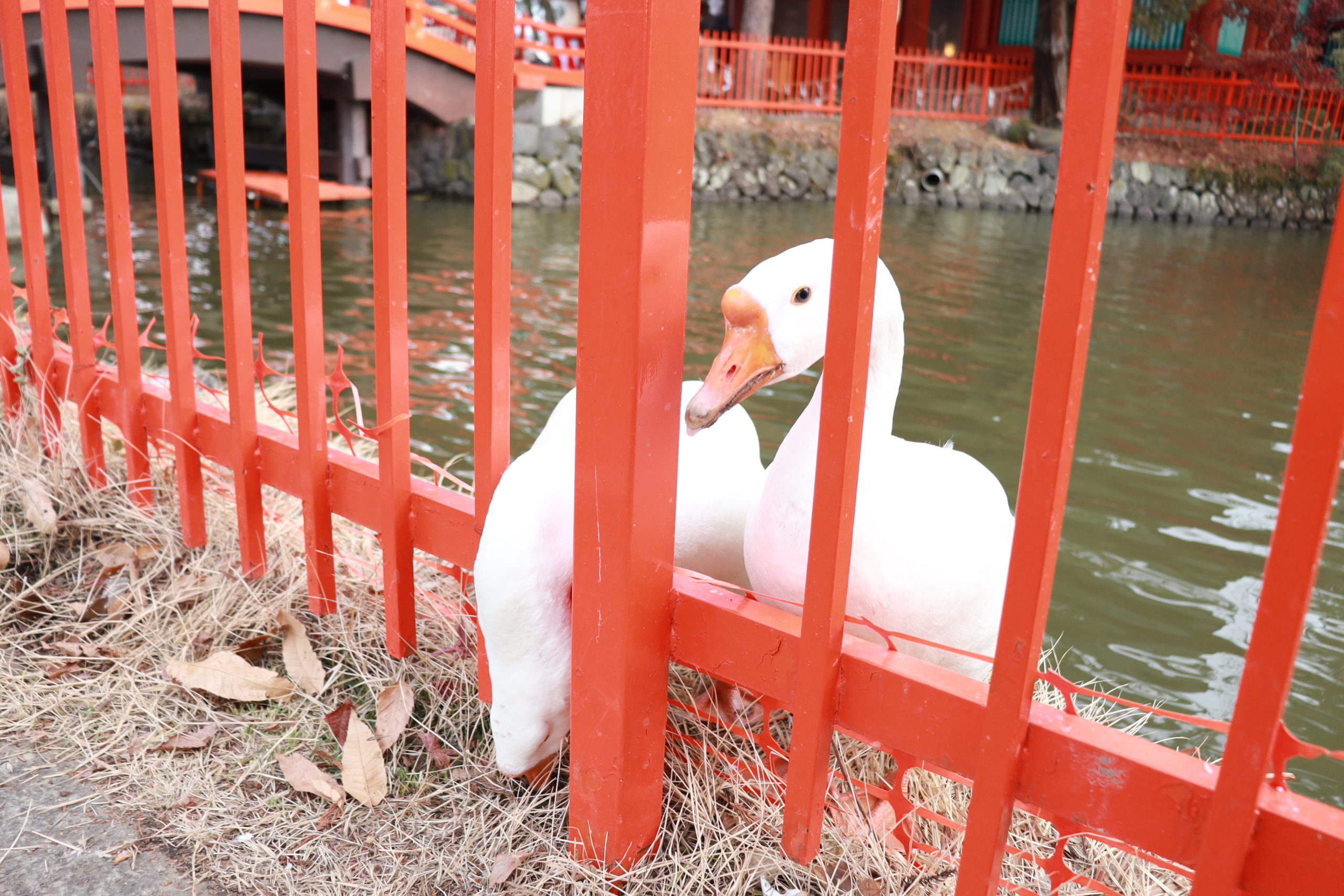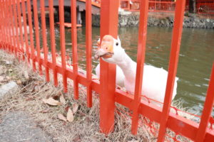 この神社の名物としてガチョウがいます。以前は「ちょうすけ」というガチョウがいたのですが、現在はシナガチョウの姉妹が神社の池で暮らしています。