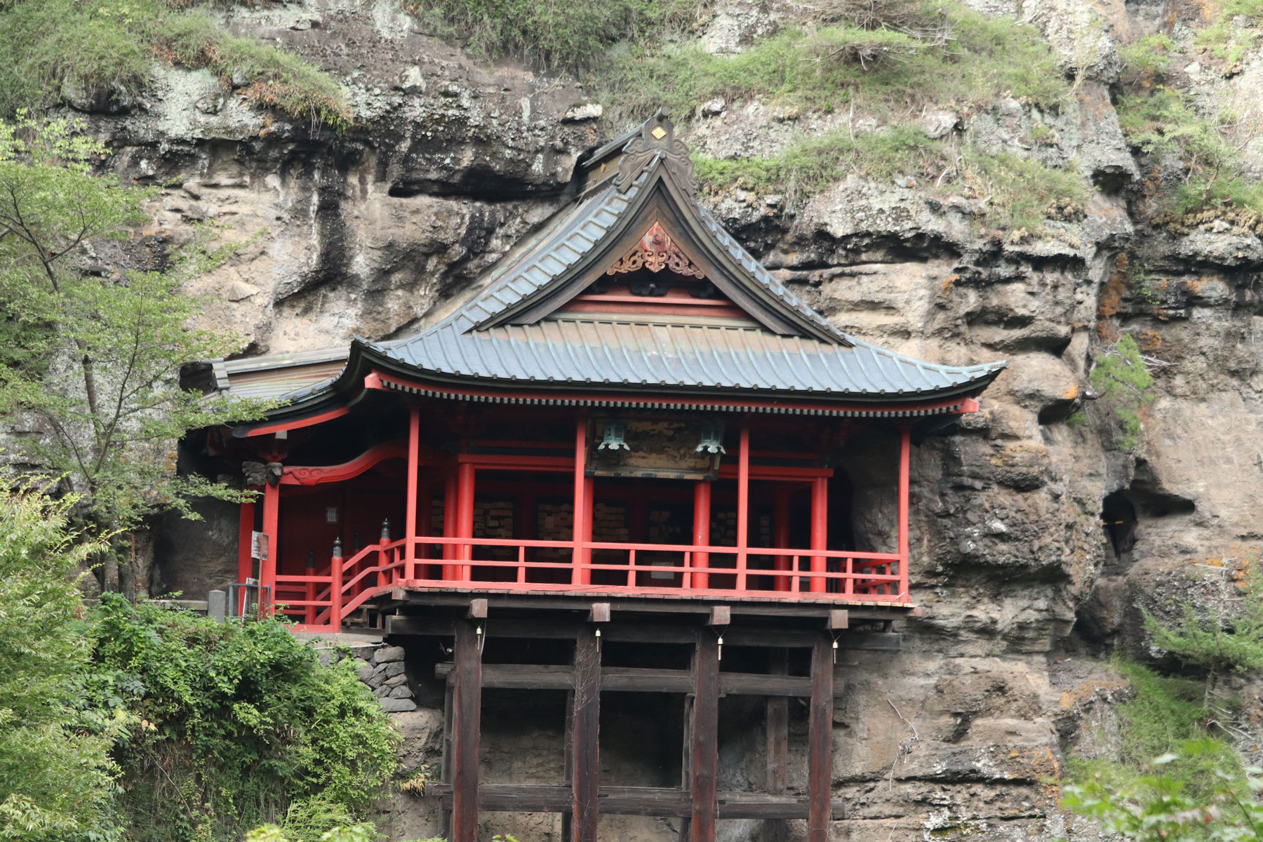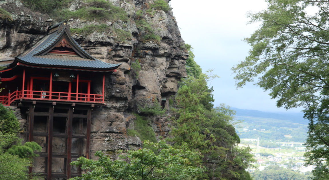 崖を背にしてせり出したお堂からは、釈尊寺や小諸市、浅間山の景色を望むことができます。