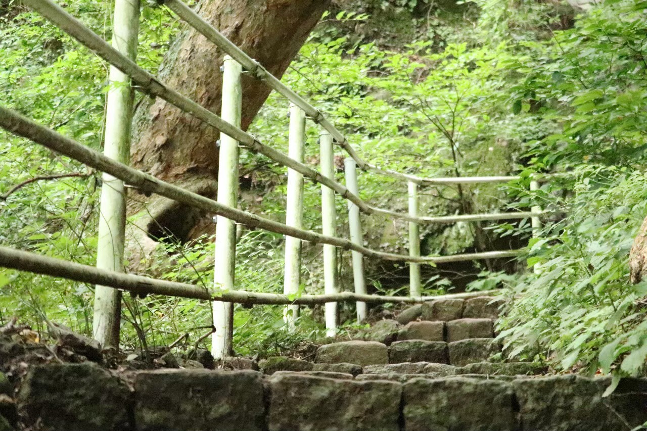 参道は断崖絶壁が左右に迫る間に設けられていて、所々で小さな滝が岩間から滴り落ち、それが川となって参道脇を流れています。