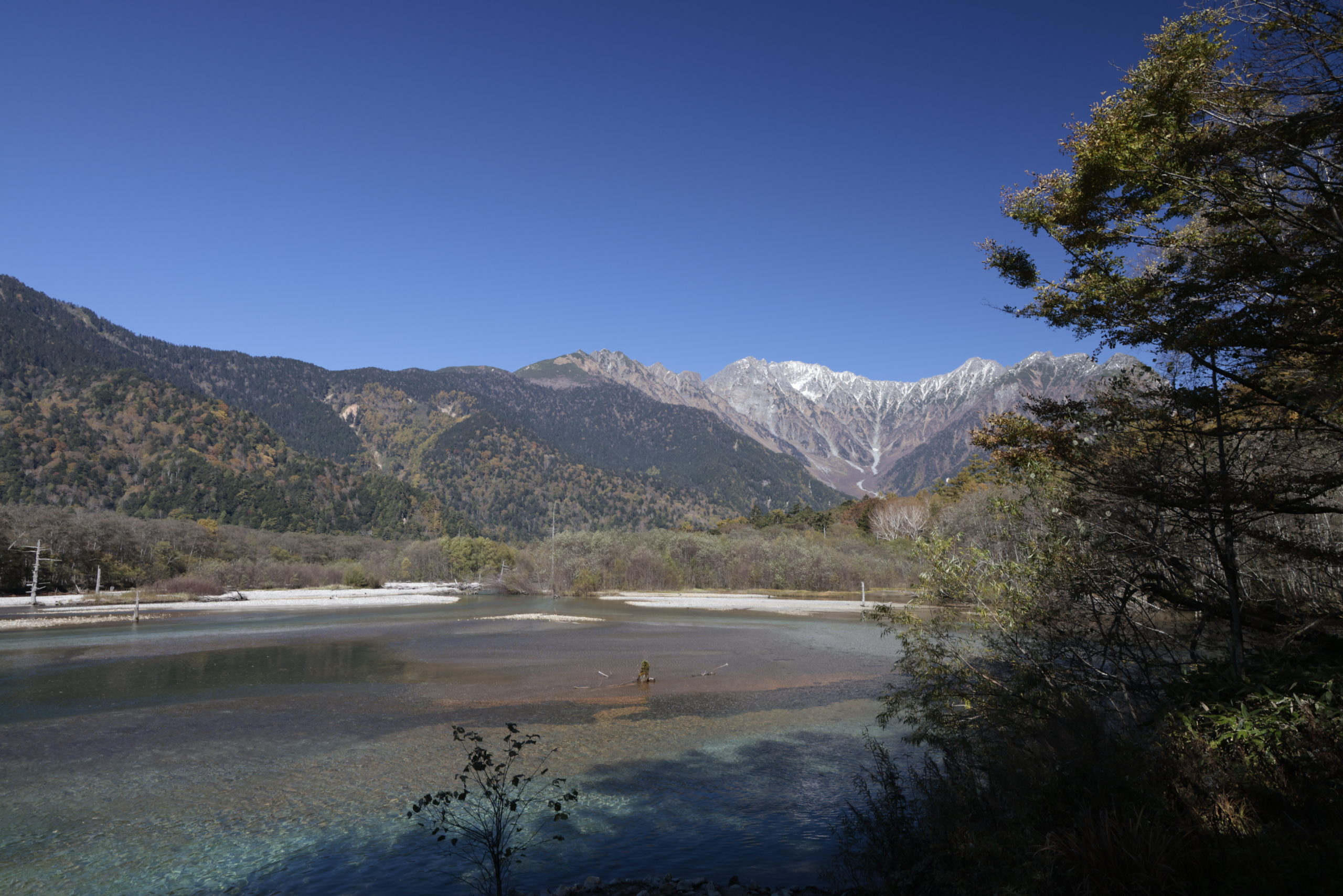 梓川の澄んだ流れ、その中に佇む立ち枯れの木々、圧巻の前穂高岳の眺め、静寂が漂う神秘の明神池…