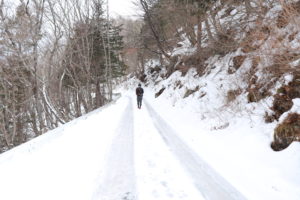 車の轍があるところは凍っていて滑るので、真ん中の雪のあるところを歩いて行きましたが、下り坂の雪道は歩きづらく、転ばないようにゆっくりと進んで行きました。