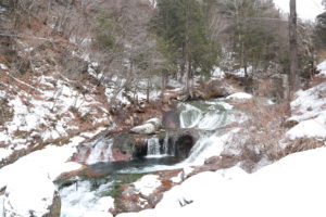 降り立った先も雪が積もっており滑りそうな感じでしたが、橋よりは足場が広かったので少し安心して滝の景色を眺めました。