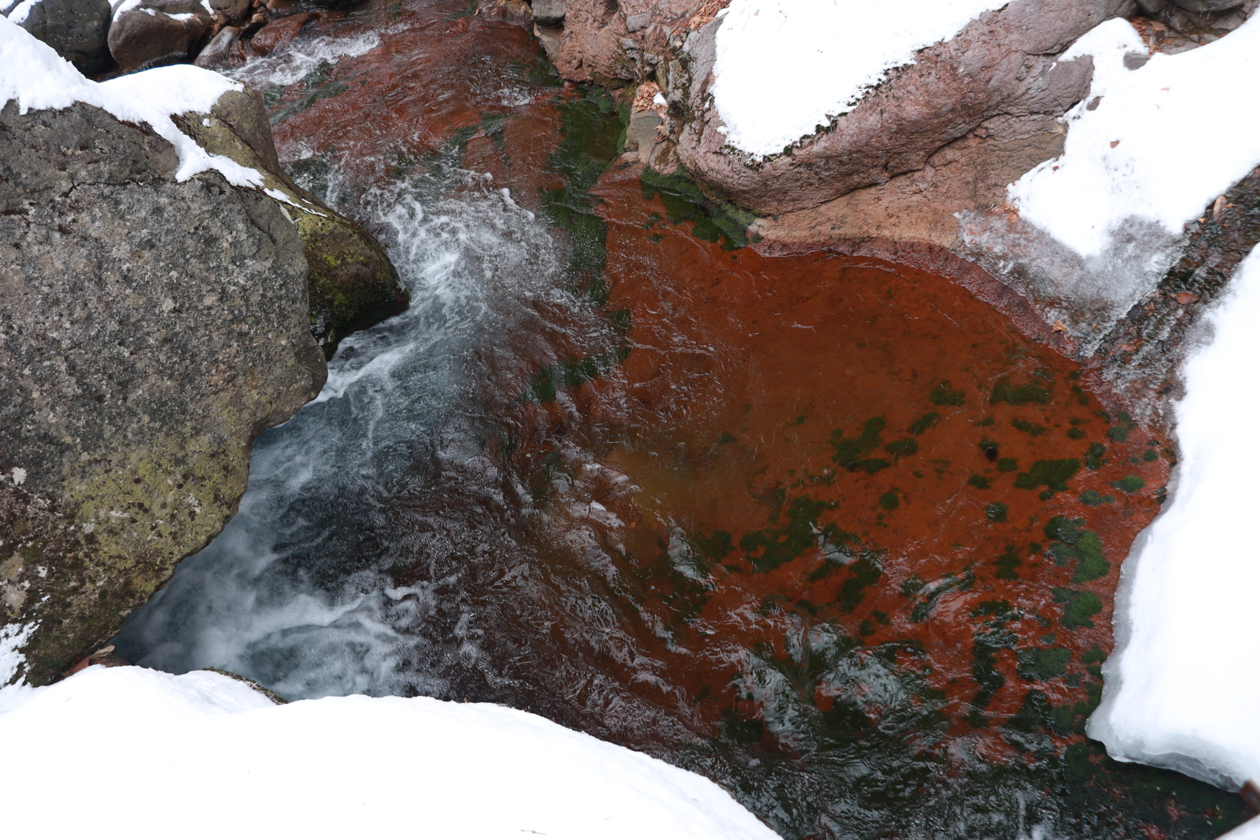 横谷渓谷・渋川の最も上流にあり、大きな赤い岩の上を何段にも流れる水の勢いは速く、