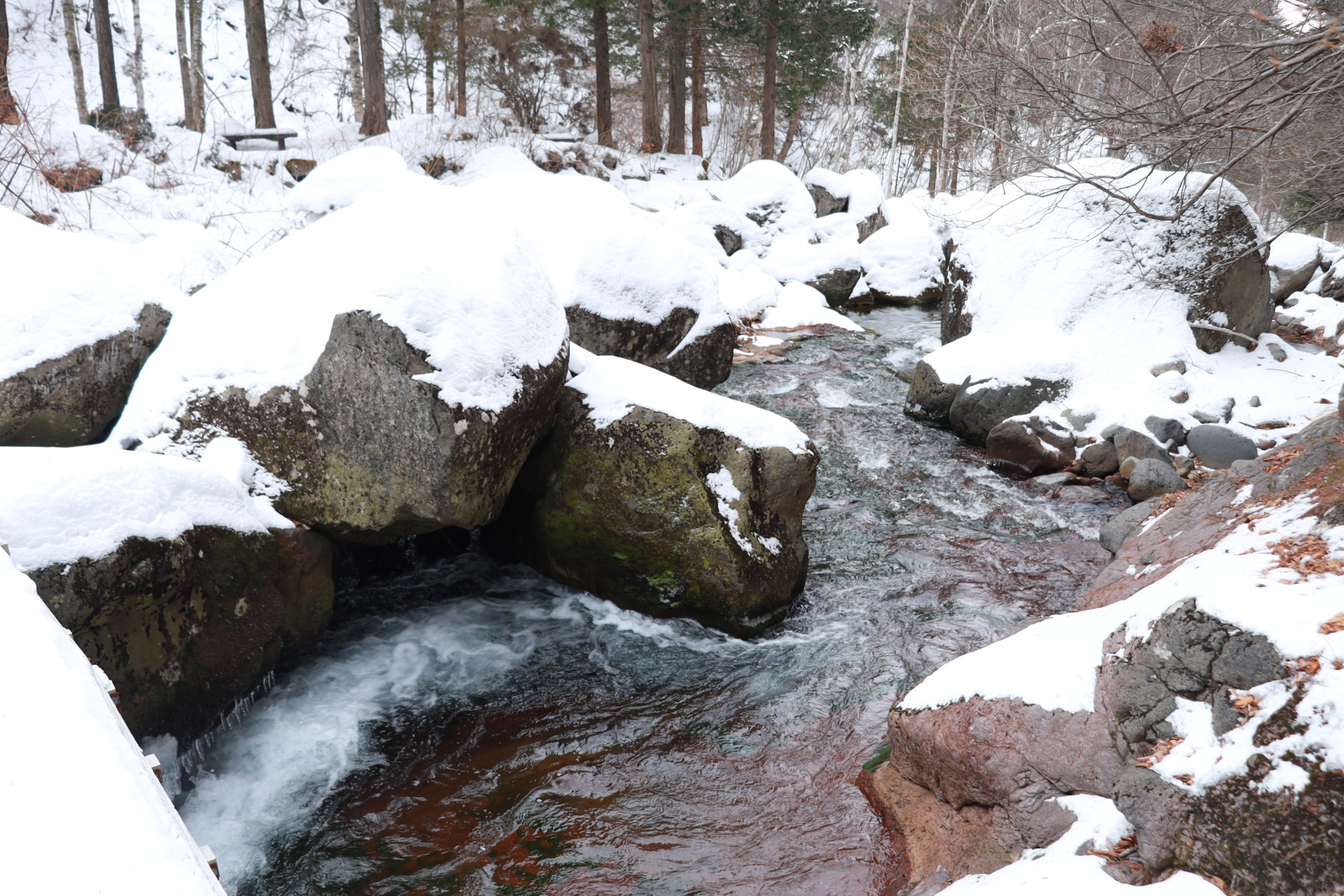 しかし、人ひとりが通れるくらいの幅で手すりはなく、雪が積もって盛り上がっていたので、渡るにはかなりの勇気がいりました。