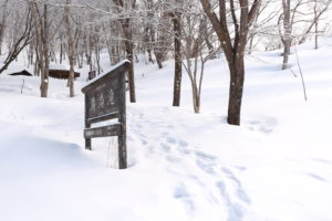 足跡が続く方向を見ると、東屋らしき屋根が見えます。きっとあそこが展望台に違いない、と期待を胸に雪と格闘しながら進みます。