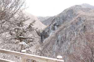 少々遠めですが、綺麗に雪化粧した周辺の山に囲まれて堂々と流れ落ちる滝は、遠くからでも大きいものだと分かりました。