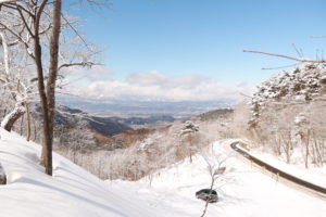 車は志賀高原に向かい、山道を上っていきます。ちょうど前日に雪が降ったせいか、道路の日が当たらない部分には雪が積もっており、ハンドルを握る相方の手に汗がにじみます(当然ですが、ノーマルタイヤでは走行できません)。