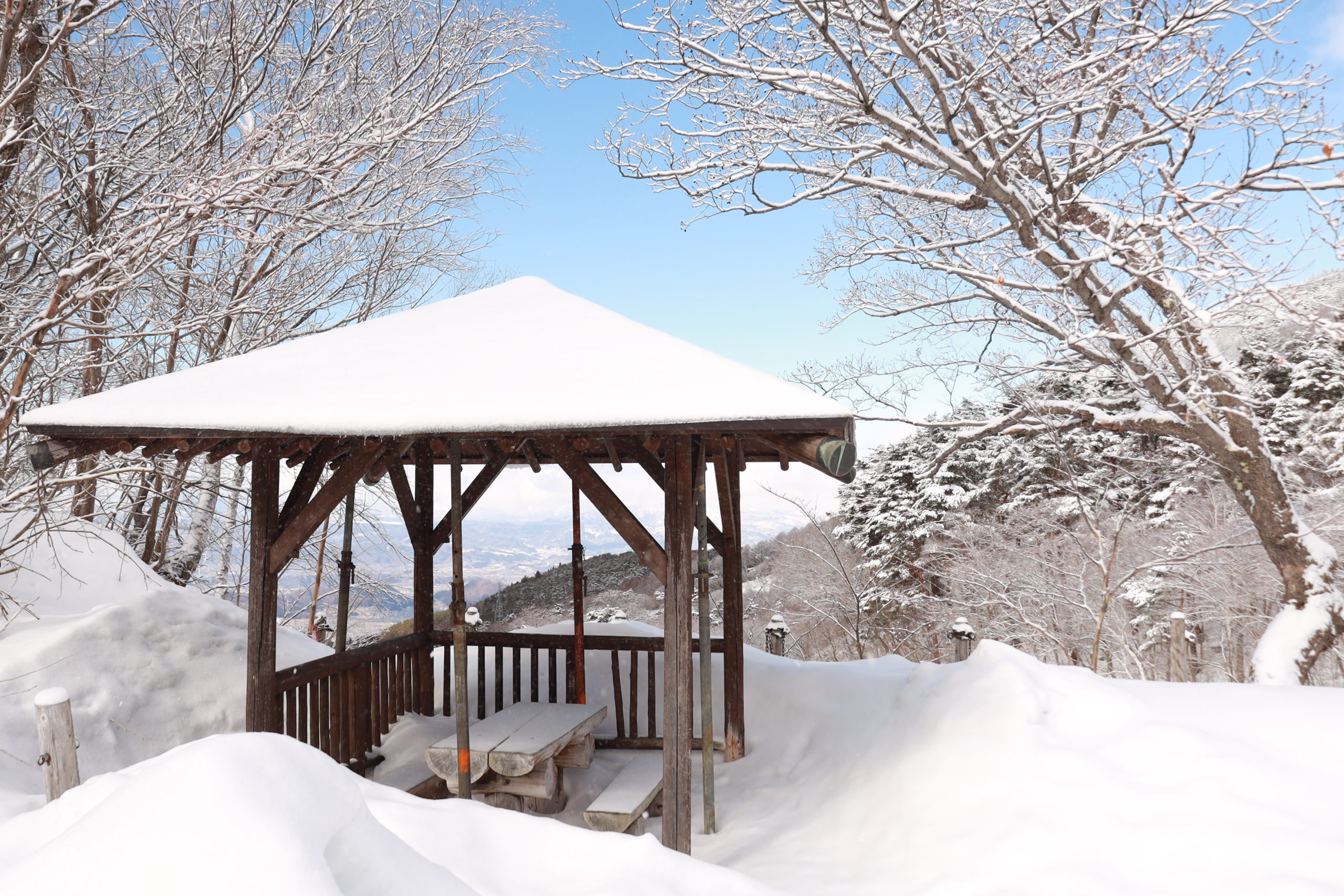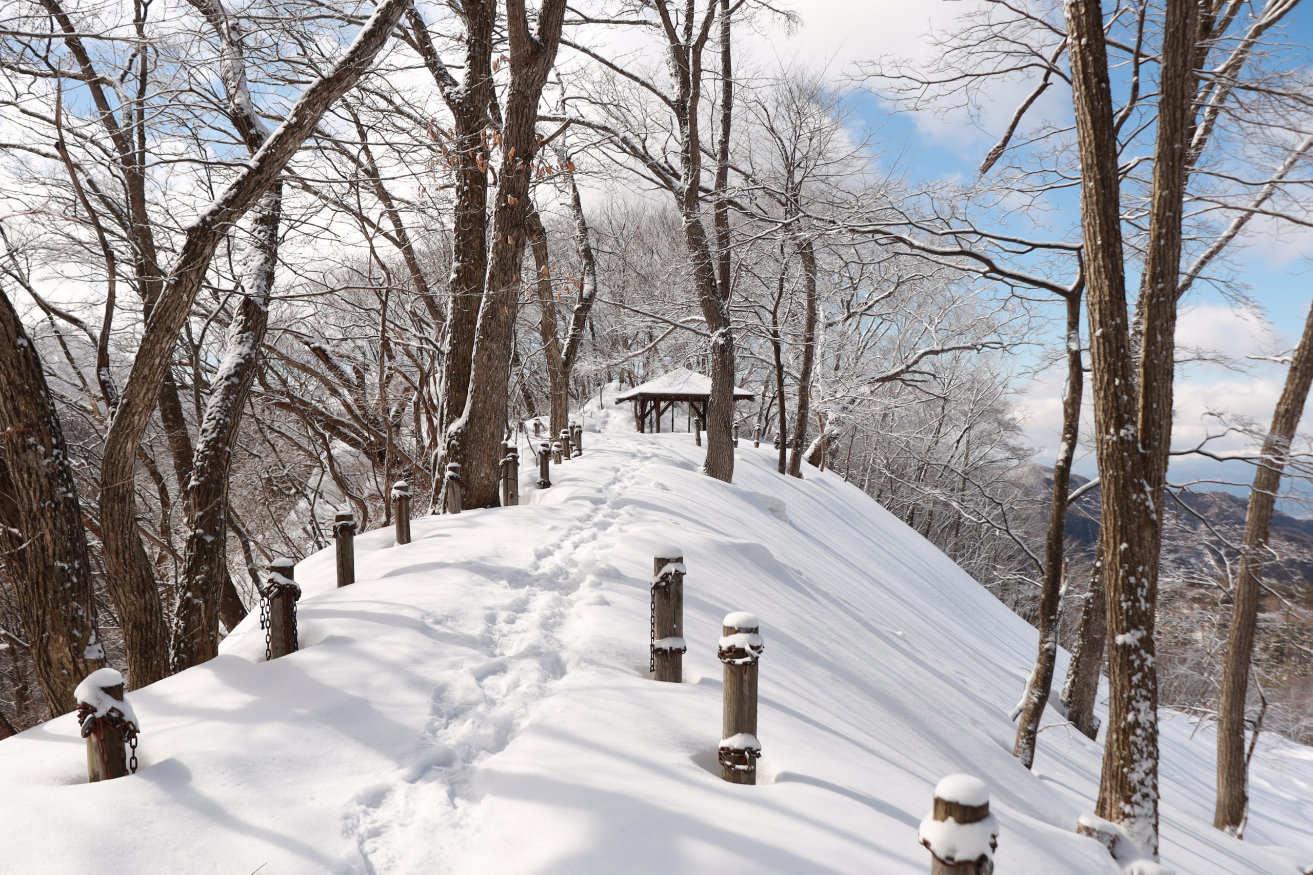 足跡が続く方向を見ると、東屋らしき屋根が見えます。きっとあそこが展望台に違いない、と期待を胸に雪と格闘しながら進みます。