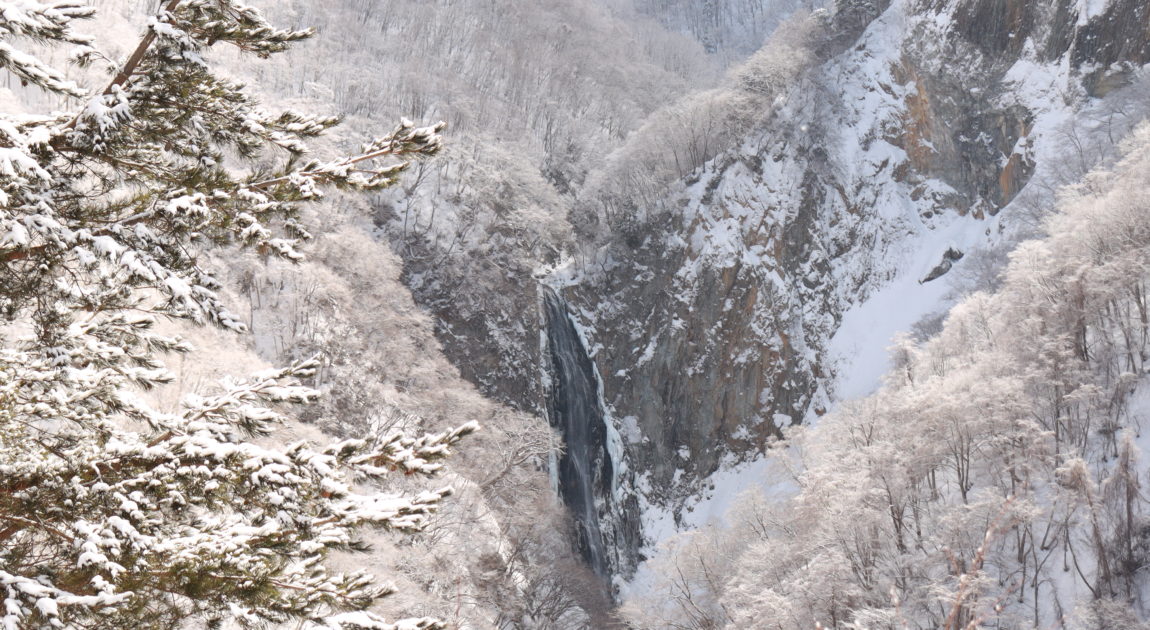 少々遠めですが、綺麗に雪化粧した周辺の山に囲まれて堂々と流れ落ちる滝は、遠くからでも大きいものだと分かりました。
