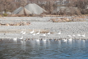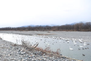 白鳥湖と言うと湖そのものを連想しますが、実際は湖はなく、犀川の中洲で白鳥たちが羽を休めています。