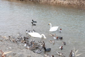 上流の方へ(南へ)数十メートル進むと、池ほどは広くありませんが流れが穏やかな場所で、そこにも白鳥とカモが滞在していました。