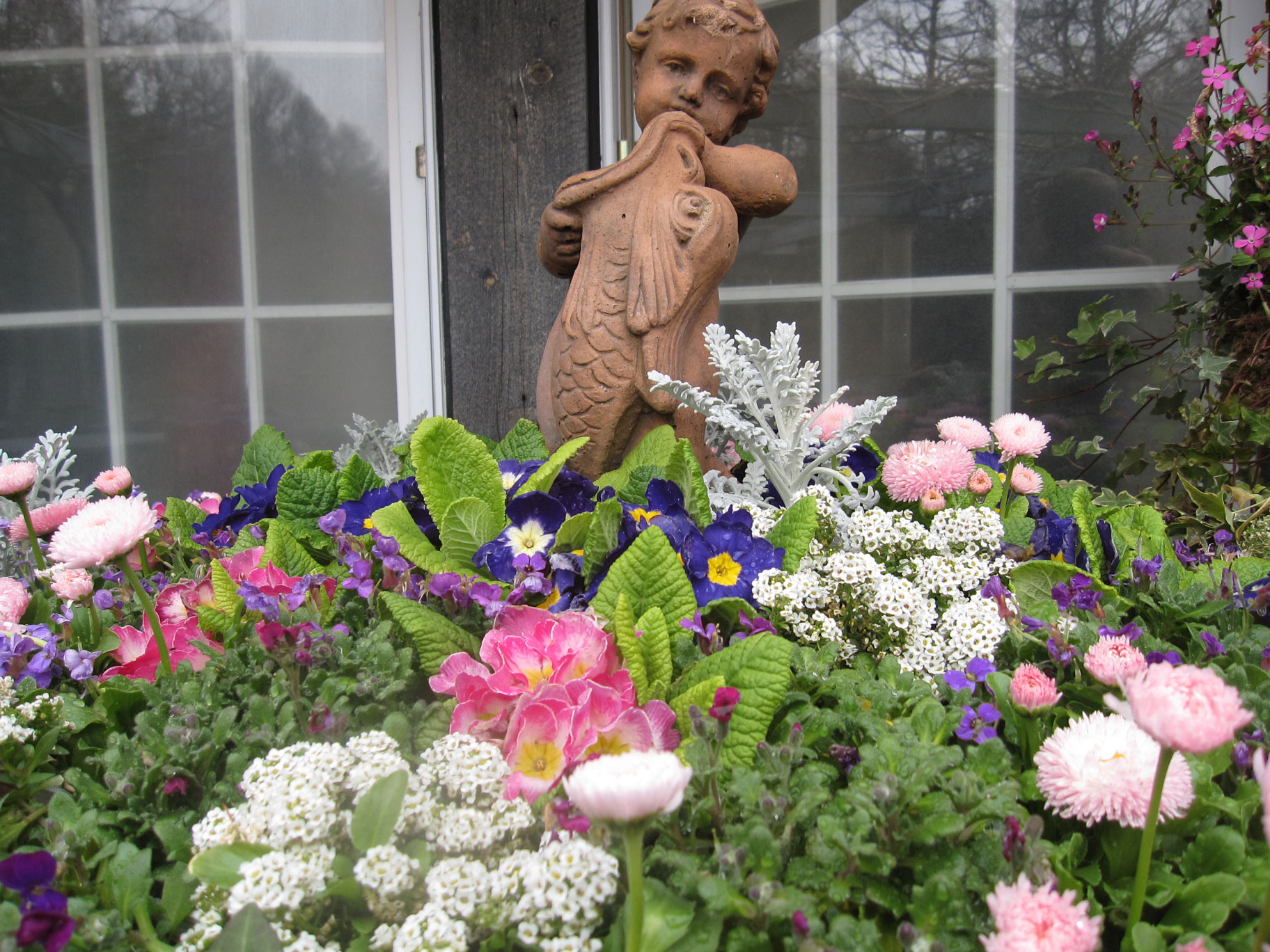 建物に沿って置かれた大きな鉢には、プリムラやパンジーなど数種類の花が寄せ植えしてありとても華やかでした。