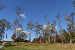 秋の装いを呈した池のほとりでは、まったりと寛げる森の駅や、